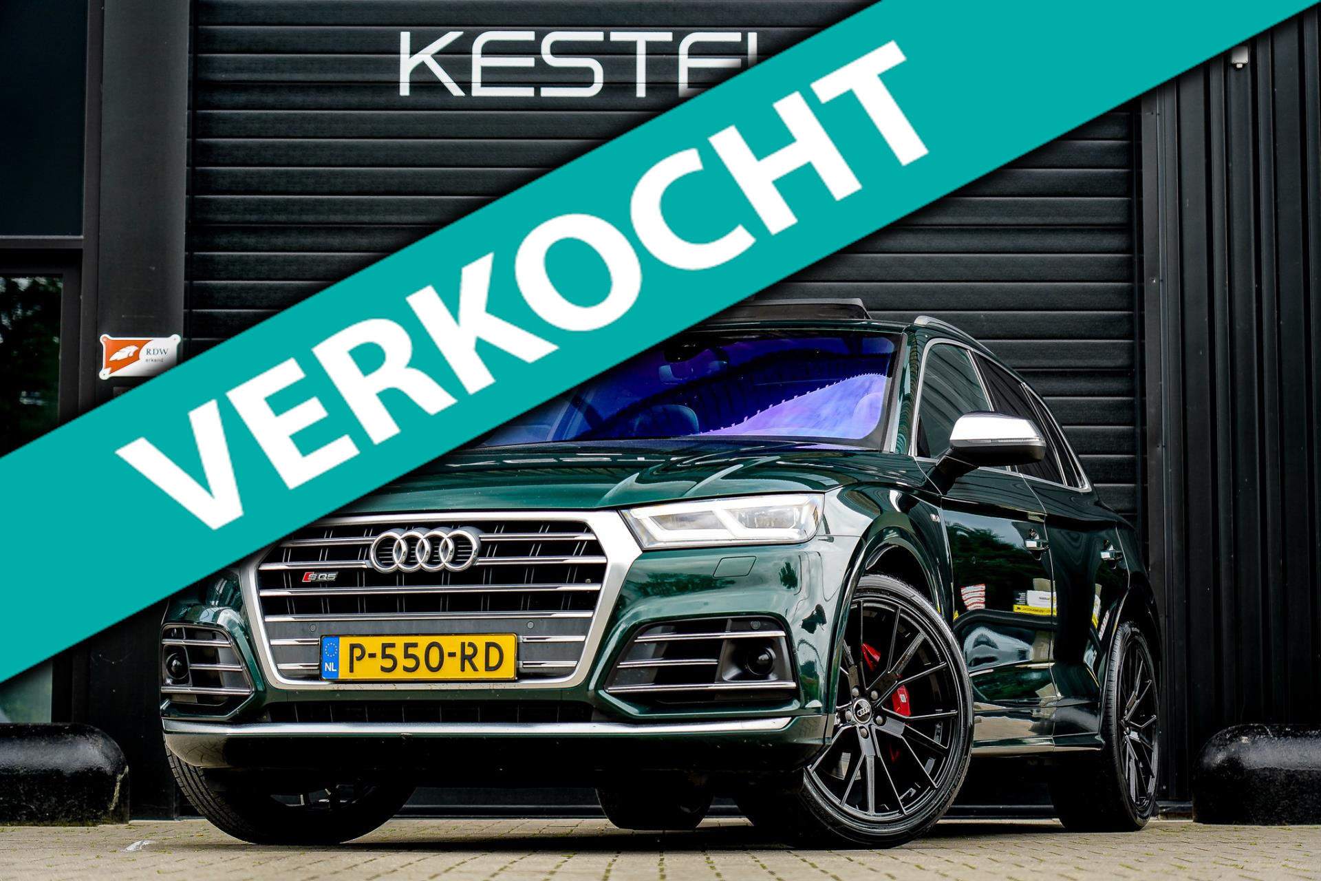 Nieuw in voorraad; schitterende Audi SQ5 in de zeldzame kleur Azorengroen metallic met zwart vollederen RS-interieur.